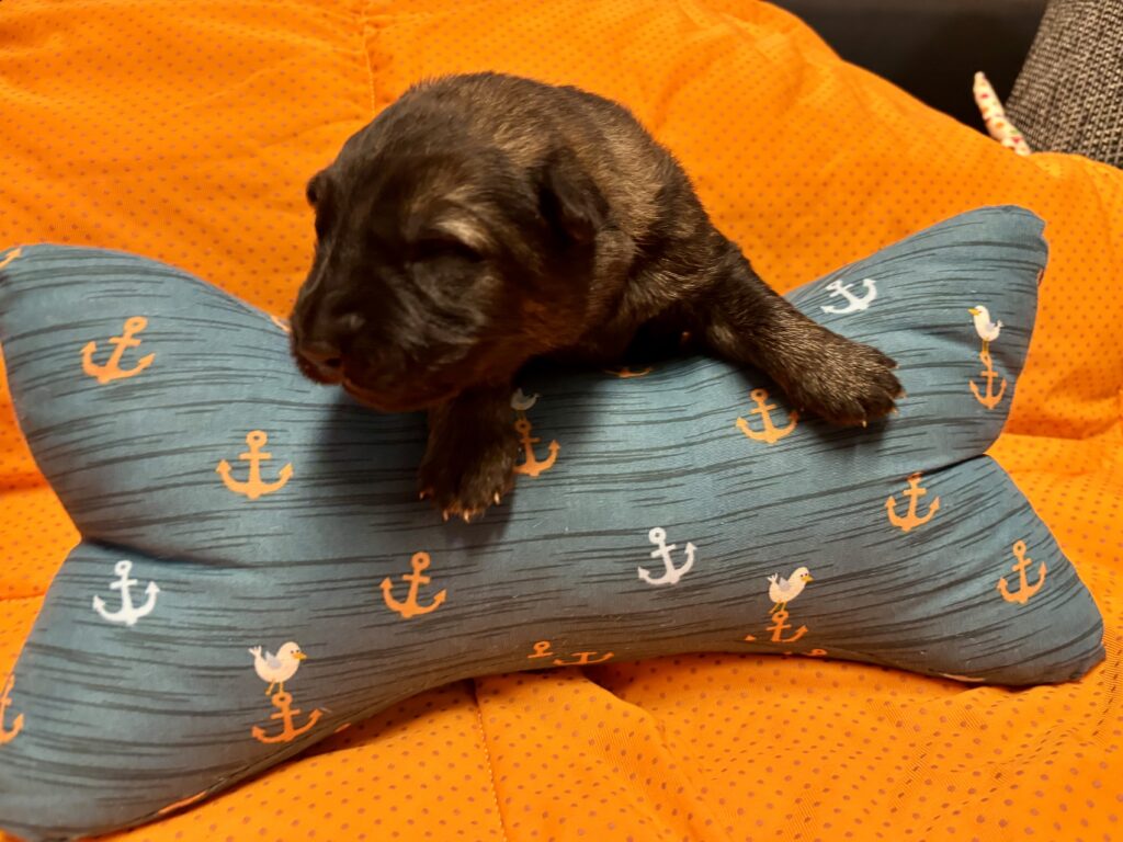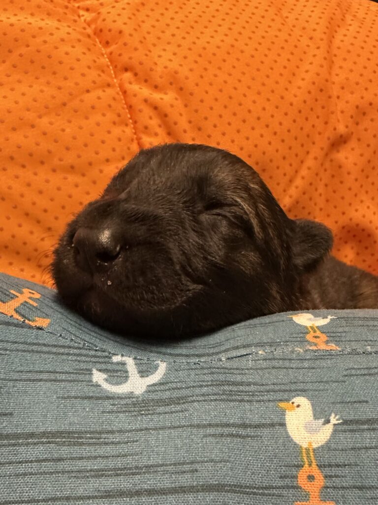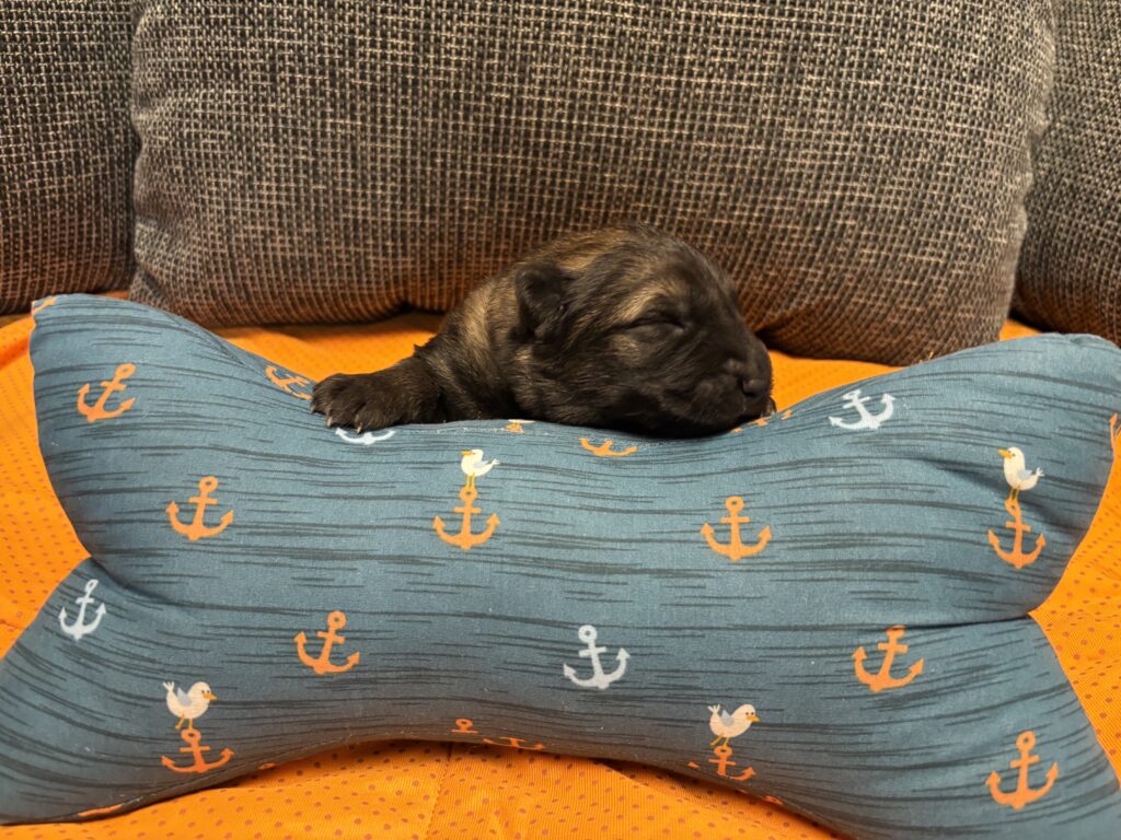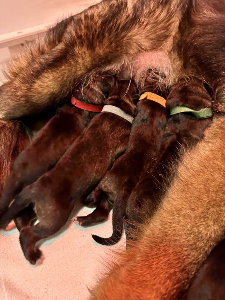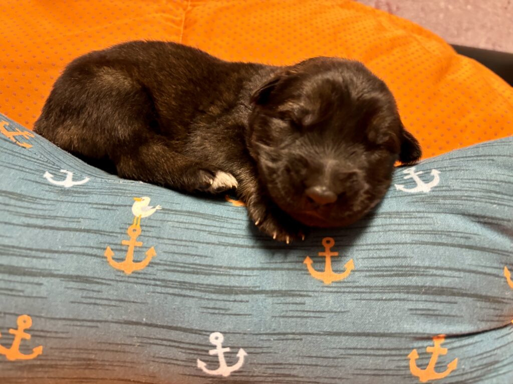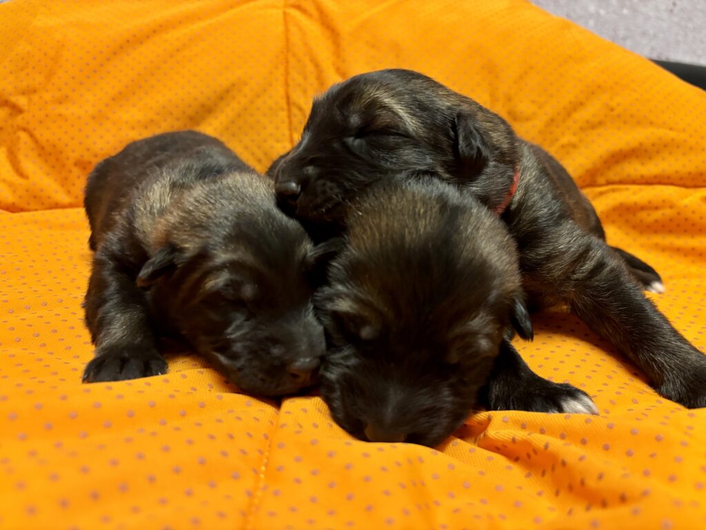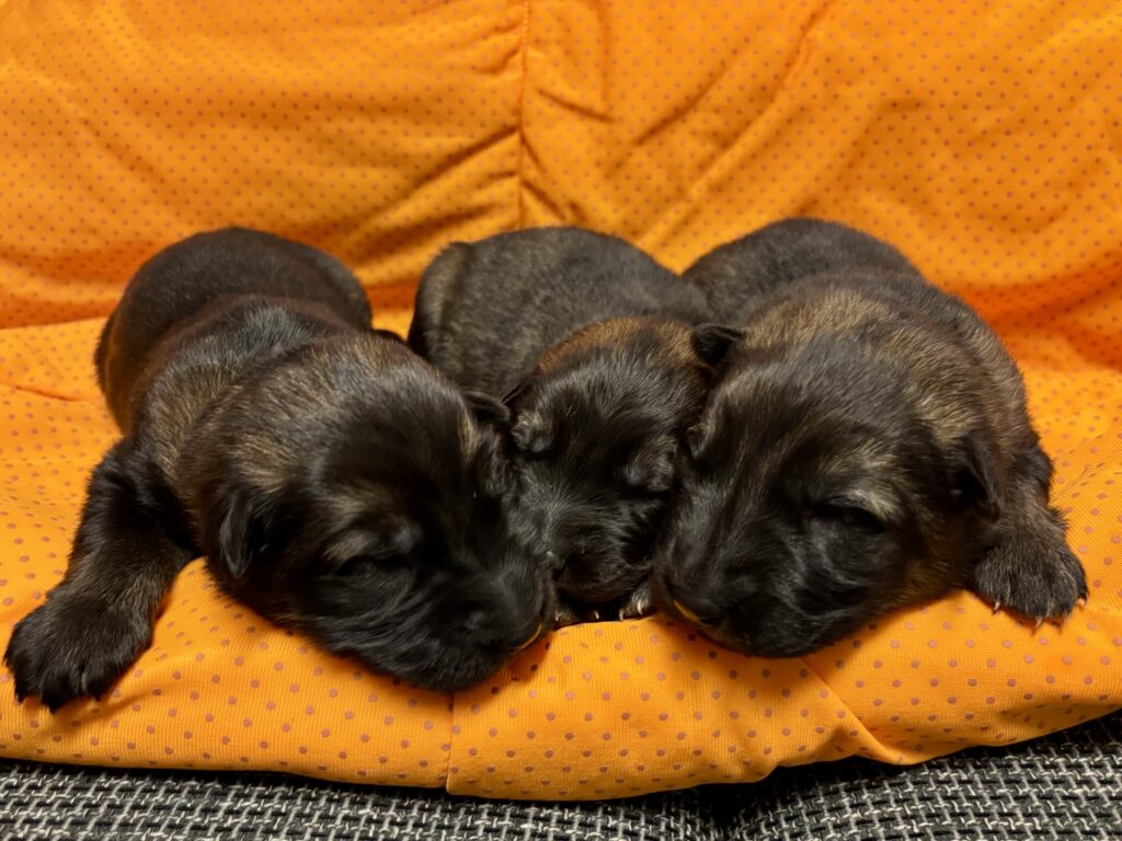 In einer komplikationslosen Geburt brachte Smartie 3 Rüden und 3 Hündinnen zur Welt. Alle Welpen sind dunkelgrau.